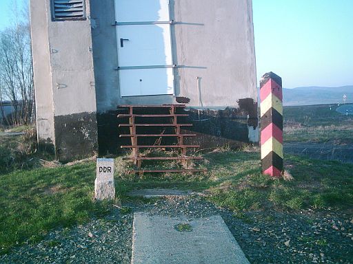 Relikte der Teilung, neu aufgestellt am Fuße der ehm. "Führungsstelle". Im Hintergrund sind die Berge des Südharzes zu sehen (Niedersachsen).