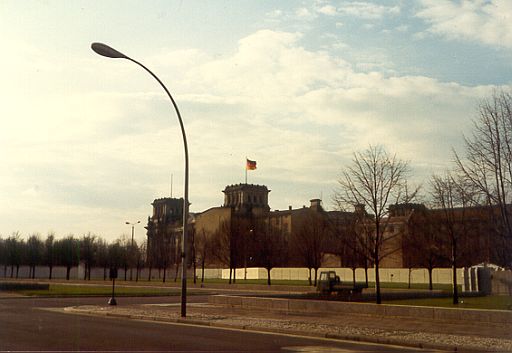 Der Reichstag von Osten aus gesehen (mit Hinterlandmauer), April 1985.
