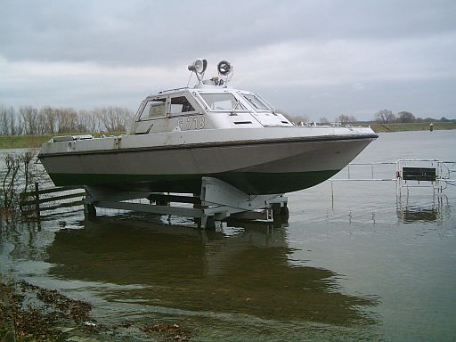 Schnellboot der DDR-Grenztruppen vor dem Museum Schnackenburg am 3.April 2006, bereits vom Elbehochwasser umspült. Reise an die Elbe bei Schnackenburg vom 31.3.-4.4.2006. |