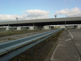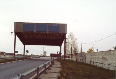 Ehemalige erste Vorkontrolle mit Wegweisern vor der Einfahrt in