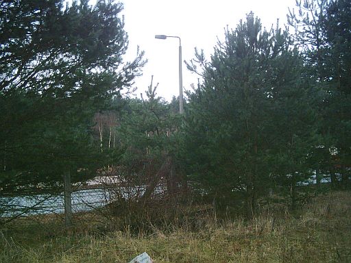 Auf dem ebenfalls beleuchteten Areal hinter dem Zaun befanden sich Garagen und Wirtschaftsgebäude, die aber auch fast alle abgerissen wurden.