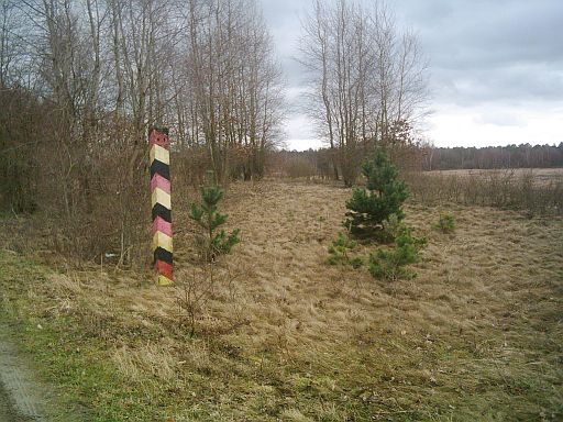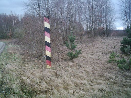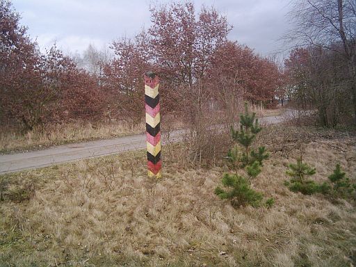 DDR-Grenzsäule zwischen Gummern und Aulosen in der Nähe der Ländergrenze Niedersachsen - Sachsen-Anhalt. Wahrscheinlich wurde sie nachträglich wieder aufgestellt, da sie verkehrt herum steht.