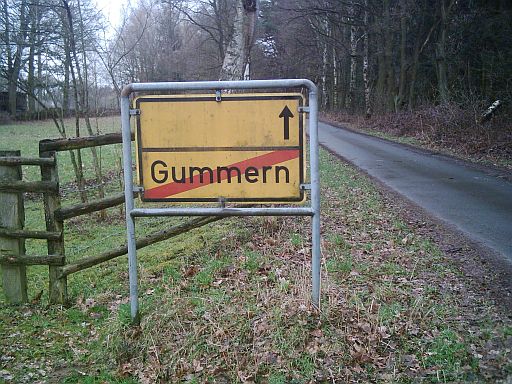 Ortsausgangsschild aus der Zeit vor der Wende an der Straße zwischen Gummern (Niedersachsen) und dem geschleiften Dorf Stresow (Sachsen-Anhalt). Scheinbar führt der Weg immer noch ins Nichts, auch 16 Jahre nach dem Ende der Teilung.