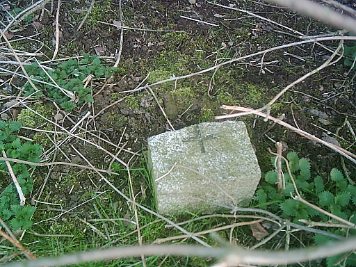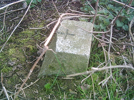 Nach mühsamer Suche findet sich unter Gestrüpp ein Grenzstein. Die linke Hälfte, auf der "DDR" stand, wurde abgeschlagen. Von wem? Vielleicht war es ein Souvenierjäger ("Mauerspecht") oder einfach nur jemand, der nicht mehr an die Zeit der Teilung erinnert werden wollte.