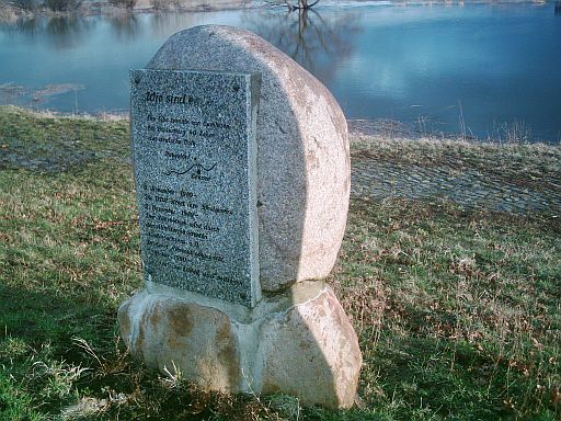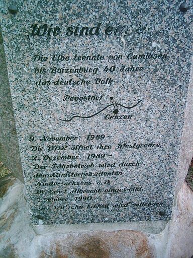 Gedenkstein zur Wiedereinrichtung des Fährdienstes und zur Wiedervereinigung.