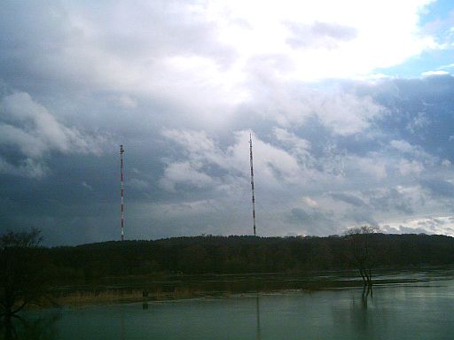 Blick ans andere Elbeufer auf die ehemalige Funküberwachungstelle Höheck bei Gartow, zu Zeiten des Kalten Krieges ein wichtiger westlicher Horchposten, heute zivil genutzt. Die Türme sind 332 bzw. 344 m hoch.