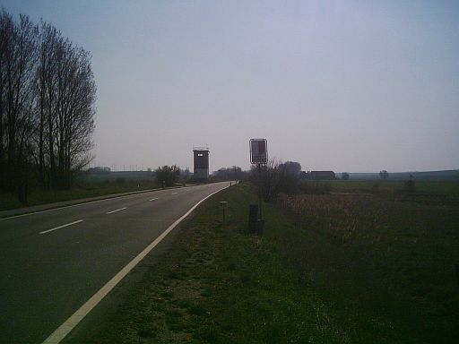 Blick aus nördlicher Richtung auf die erhaltene ehemalige "Führungstelle" der Grenztruppen an der B 79 zwischen Wolfenbüttel und Halberstadt. Die Straße führt von hier direkt in das "Große Bruch".