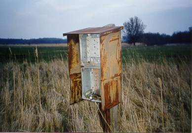 Telefonverteilerkasten im ehemaligen Kontrollstreifen, in dem Kabel des Postentelefonnetzes verteilt wurden.