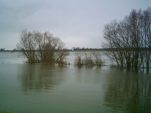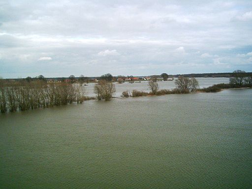 Blick über die Hochwasser führende Elbe nach Lütkenwisch in Brandenburg. Dieses Dorf, das Schnackenburg seit 1991 wieder mit einer Fähre verbindet, sollte einmal zu DDR-Zeiten wegen seiner Grenznähe evakuiert und abgerissen werden, was dann glücklicherweise dann doch nich geschah.