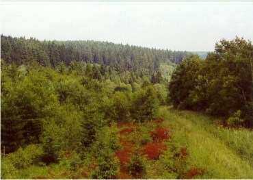 Westlich Lehesten, Juni 2002. Die kleinen Wälder aus Birken, Espen und Weiden bilden einen wichtigen ökologischen Gegensatz zu den monotonen Fichtenforsten auf der bayrischen Seite der ehemaligen Grenze.