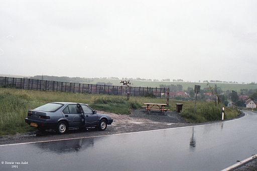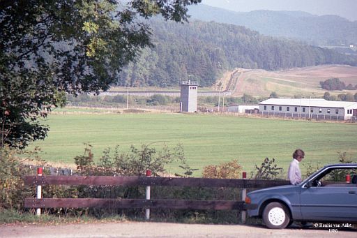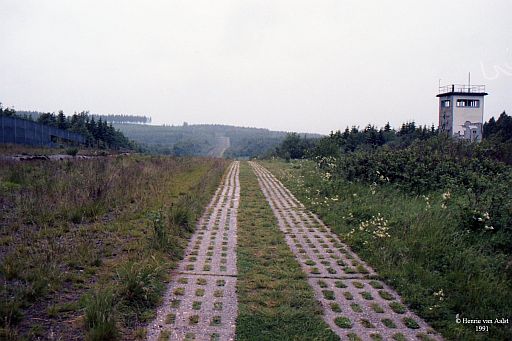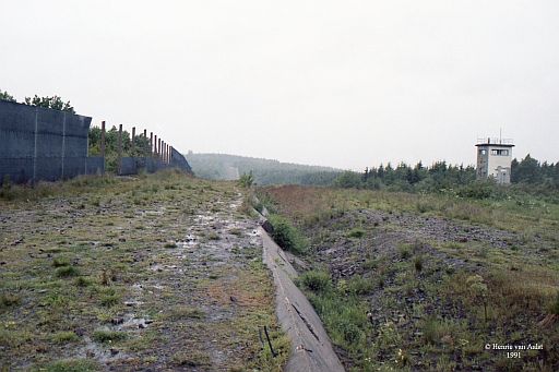 Wachturm, Überreste des Grenzzauns und der "KFZ-Sperrgraben" sind im Juni 1991 noch vorhanden.