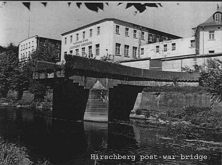 Die Lederfabrik Hirschberg hinter der bei Kriegsende zerstörten Saalebrücke. |