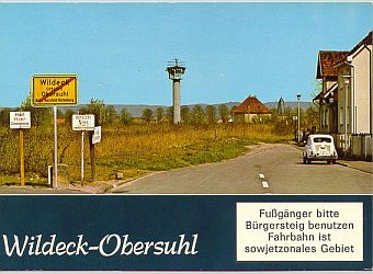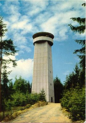Die Thüringer Warte auf dem Ratzenberg bei Lauenstein/Bayern in unmittelbarer Nähe zur DDR-Grenze. Besonders viele ehemalige Thüringer nutzten von hier aus die Gelegenheit, bis zu 50 km in ihre alte Heimat zu schauen (Ansichtskarte von 1965).