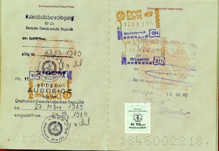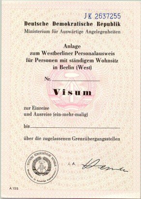 ![]() Visum als Anlage für Bürger aus Berlin (West). Da die DDR ihren Reisepass nicht anerkannte, mussten sie bei der Einreise ihren Personalausweis vorlegen. |