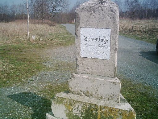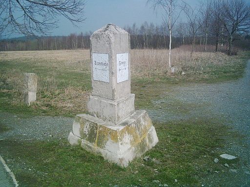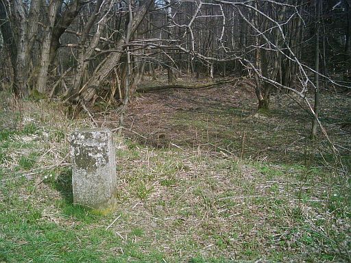 Alter Grenzstein zwischen den Gemeinden Hohegeiß und Benneckenstein an der Ortsdurchfahrt (Kirchstraße, hier gleichzeitig die B4) durch Hohegeiß. Im Hintergrund der ehemalige Grenzstreifen.