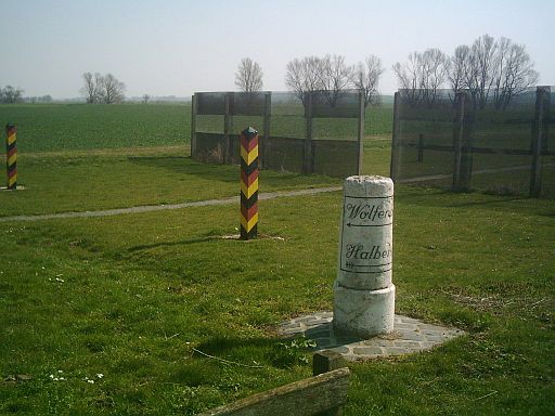 Rekonstruierte Gedenkstätte Grenze (Mattierzoll-Hessen) kurz vor der ehemaligen Trennlinie auf niedersächsischer Seite. Zwischen Mattierzoll (Niedersachsen) und Hessen (Sachsen-Anhalt) am Rande des Nordharzes. 9 Aufnahmen vom 1.April 2007