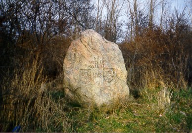 Gedenkstein auf der ehemaligen Trennlinie: "Nie wieder geteilt - 3.Febr. 1990"