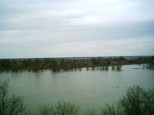 Blick über die Hochwasser führende Elbe nach Lütkenwisch in Brandenburg. Dieses Dorf, das Schnackenburg seit 1991 wieder mit einer Fähre verbindet, sollte einmal zu DDR-Zeiten wegen seiner Grenznähe evakuiert und abgerissen werden, was dann glücklicherweise dann doch nich geschah.