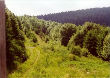 Westlich Lehesten, Juni 2002. Die kleinen Wälder aus Birken, Espen und Weiden bilden einen wichtigen ökologischen Gegensatz zu den monotonen Fichtenforsten auf der bayrischen Seite der ehemaligen Grenze.