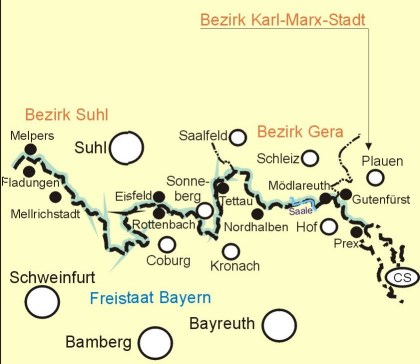 Von Fladungen in der Rhön bis zum gemeinsamen Dreiländereck mit der CSSR und der DDR bei Prex erstreckte sich über eine Länge von 421,9 Kilometern die Landesgrenze Bayerns zur DDR bzw deren Bezirke Suhl, Gera und Karl-Marx-Stadt. Über Jahrzehnte hinweg galt das Dorf Mödlareuth als Symbol der deutschen Teilung. Während sich die Bewohner des östlichen Teiles den Reglementierungen des Grengesetzes der DDR fügen mussten, erlangte der westliche Teil des Ortes Berühmtheit als traurige Touristenattraktion. In einem Gespräch während des offiziellen Besuches von Erich Honecker in der Bundesrepublik befürwortete am 11. September 1987 in München der bayerische Ministerpräsident Franz Josef Strauß die Schaffung eines neuen Grenzübergangs bei Ludwigsstadt an der B 85 sowie den Bau der Autobahn Hof-Plauen. |